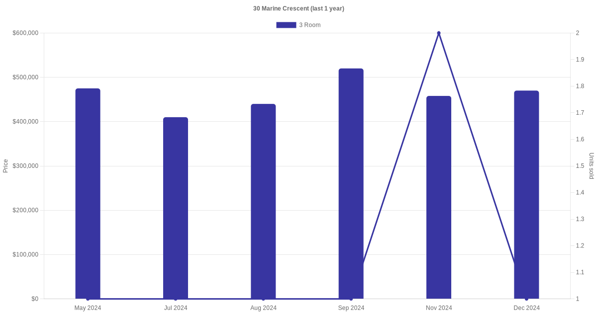 Below is a quick summary of the resale transactions volume and average price trends for the 3 room units at 30 Marine Crescent.