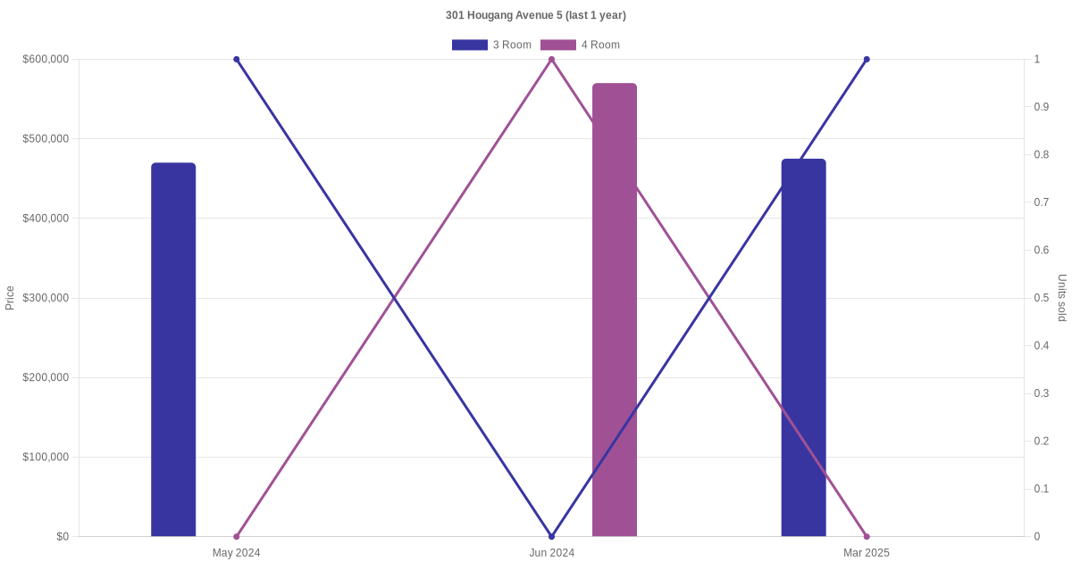 Below is a quick summary of the resale transactions volume and average price trends for the 3 room and 4 room units at 301 Hougang Avenue 5.