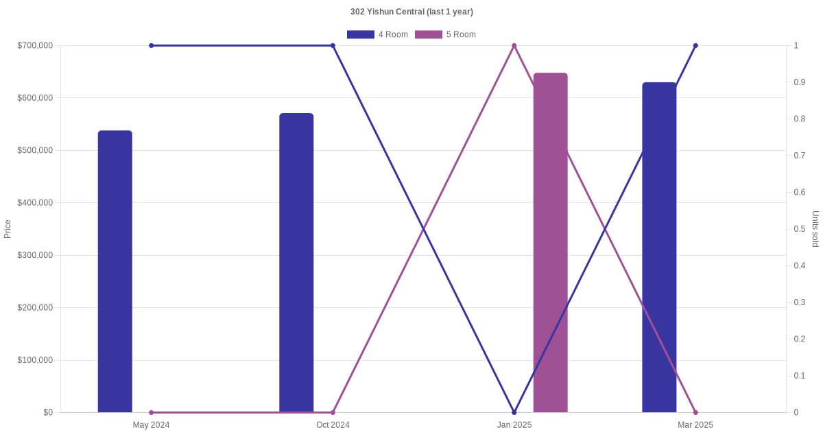 Below is a quick summary of the resale transactions volume and average price trends for the 4 room and 5 room units at 302 Yishun Central.
