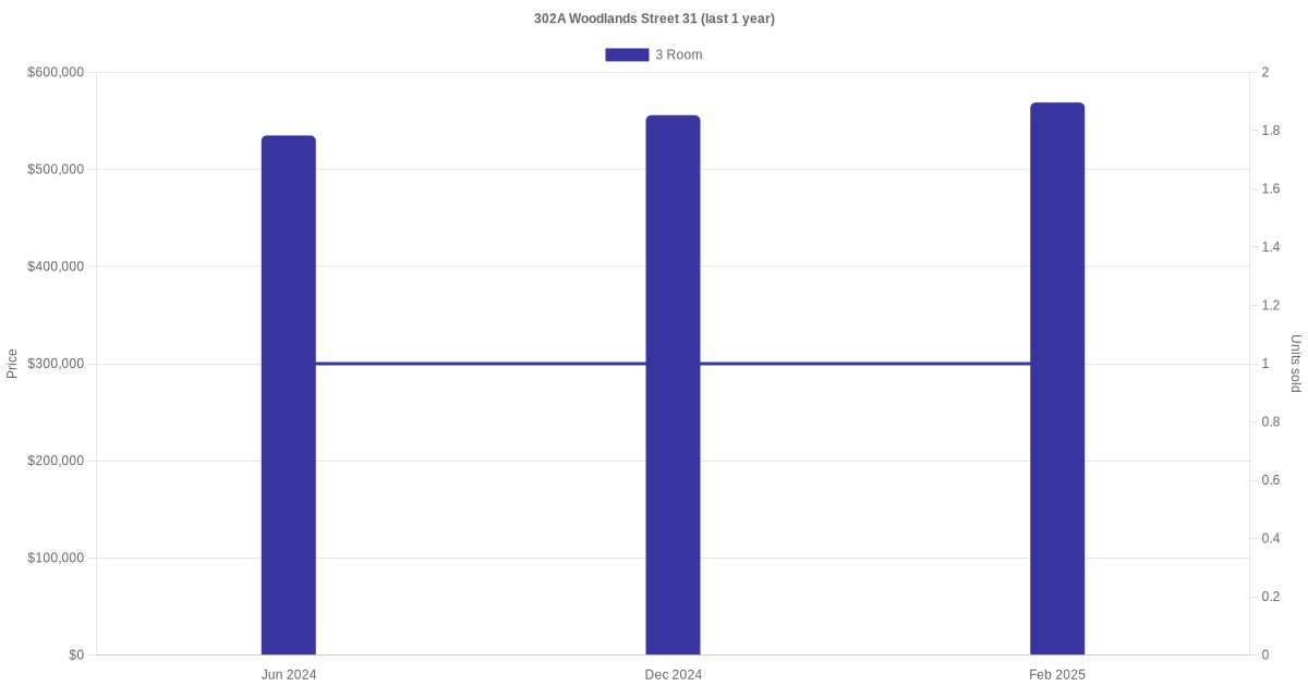 Below is a quick summary of the resale transactions volume and average price trends for the 3 room units at 302A Woodlands Street 31.