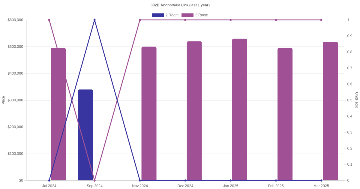 Below is a quick summary of the resale transactions volume and average price trends for the 2 room and 3 room units at 302B Anchorvale Link.