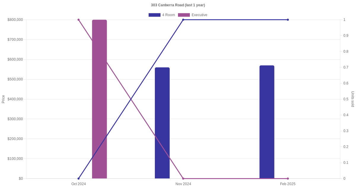 | Apr 2025 | $870,000 | $6,214 | Executive | Blk 303 Canberra Road Executive / 140 sqm | 10 to 12 | 140 sqm | Apartment | 1998 |
