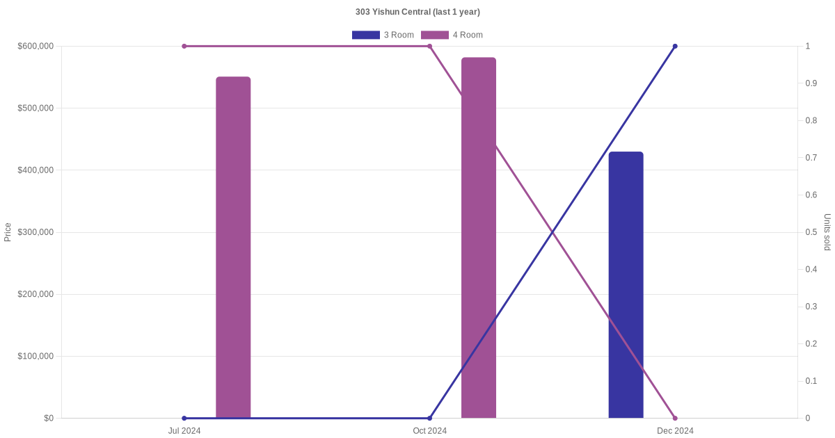 Below is a quick summary of the resale transactions volume and average price trends for the 3 room and 4 room units at 303 Yishun Central.