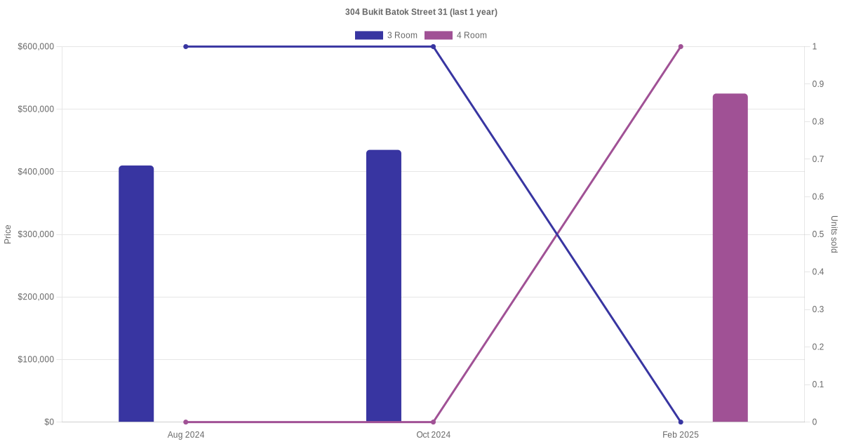 There were a total of 6 resale transactions in the last 3 years for units in block 304 Bukit Batok Street 31, with the latest one recorded in Dec 2025.