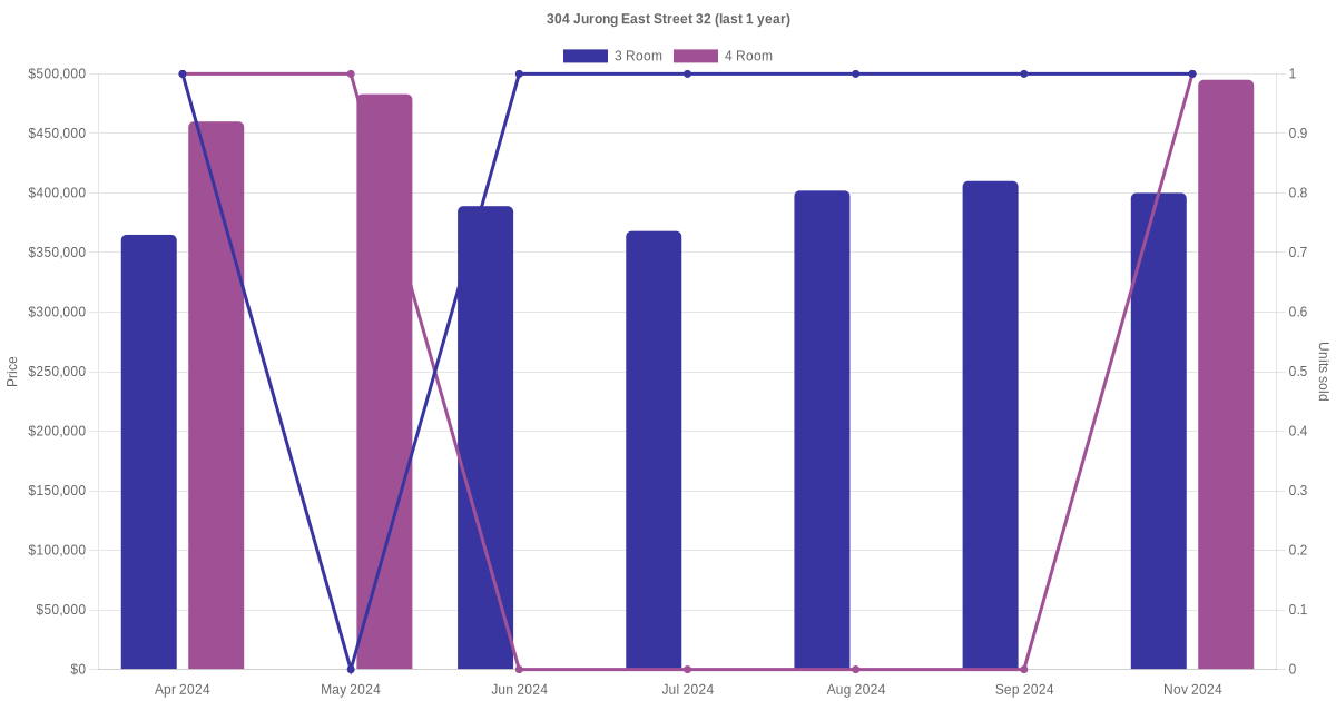Below is a quick summary of the resale transactions volume and average price trends for the 3 room and 4 room units at 304 Jurong East Street 32.