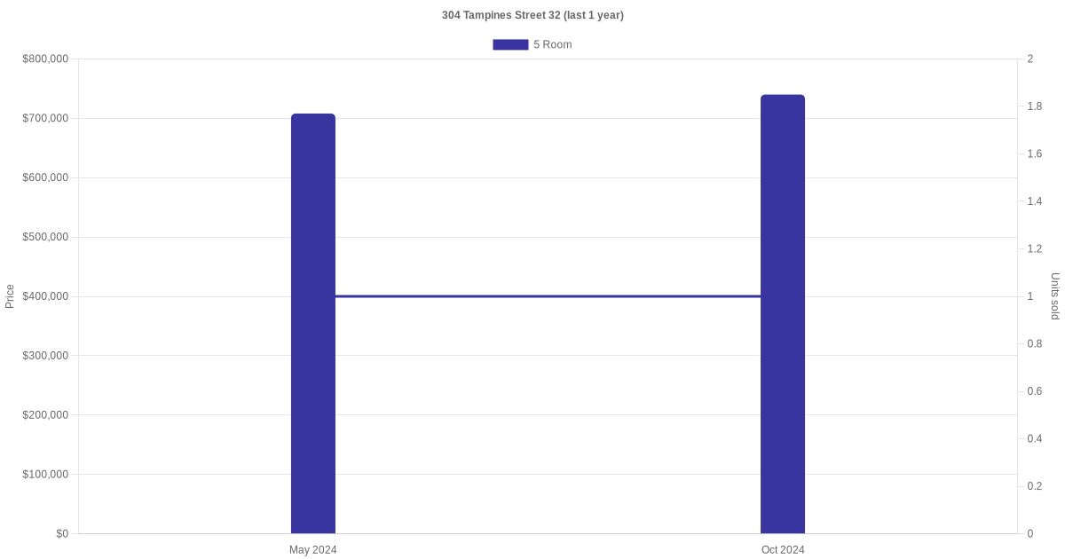 There were a total of 2 resale transactions in the last 3 years for units in block 304 Tampines Street 32, with the latest one recorded in Oct 2024.
