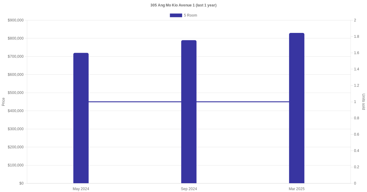 Below is a quick summary of the resale transactions volume and average price trends for the 5 room units at 305 Ang Mo Kio Avenue 1.