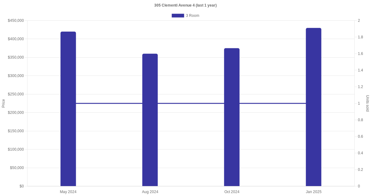 Below is a quick summary of the resale transactions volume and average price trends for the 3 room and 4 room units at 305 Clementi Avenue 4.