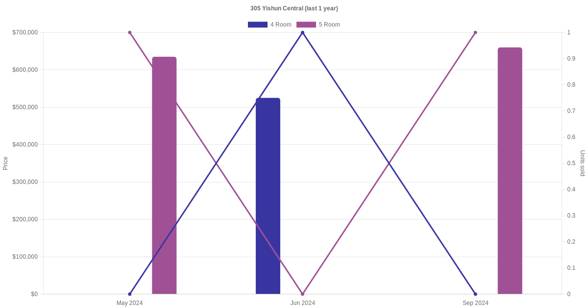 Below is a quick summary of the resale transactions volume and average price trends for the 4 room and 5 room units at 305 Yishun Central.
