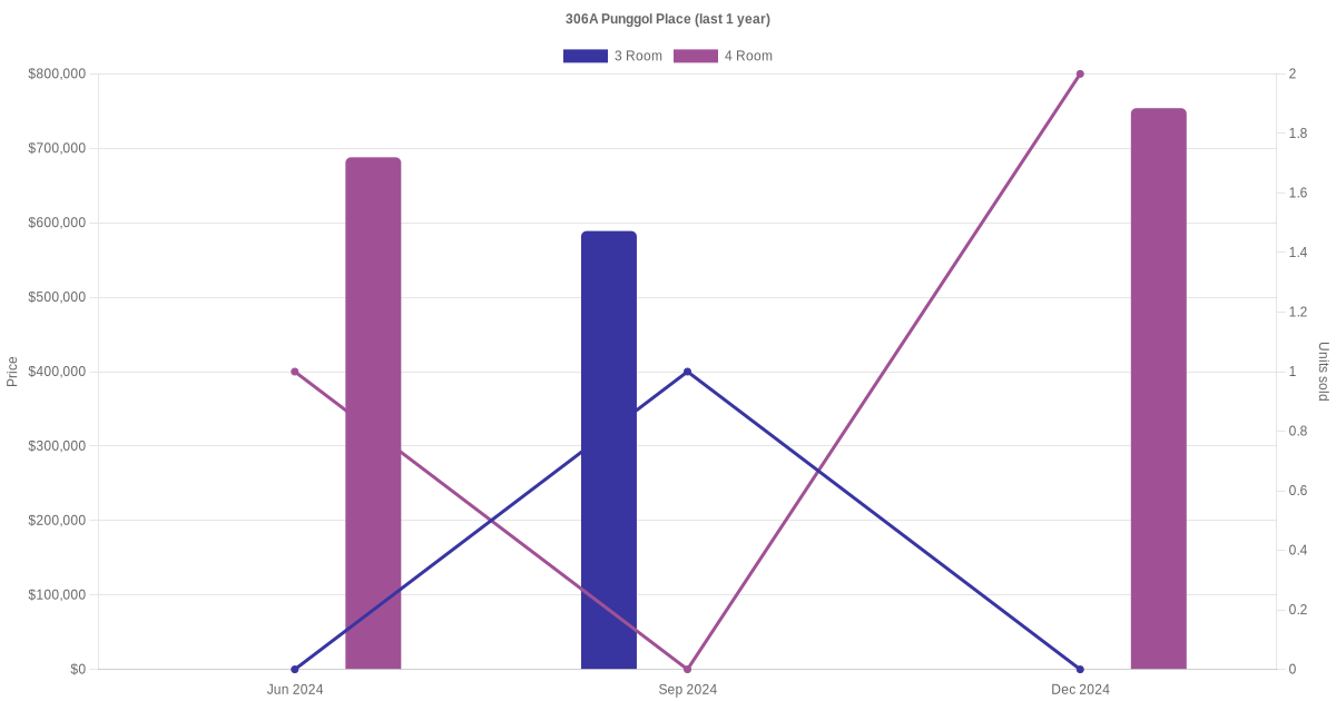 Below is a quick summary of the resale transactions volume and average price trends for the 3 room and 4 room units at 306A Punggol Place.
