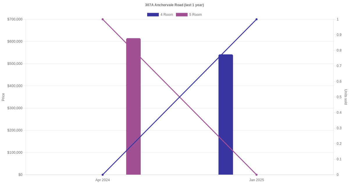 Below is a quick summary of the resale transactions volume and average price trends for the 4 room and 5 room units at 307A Anchorvale Road.
