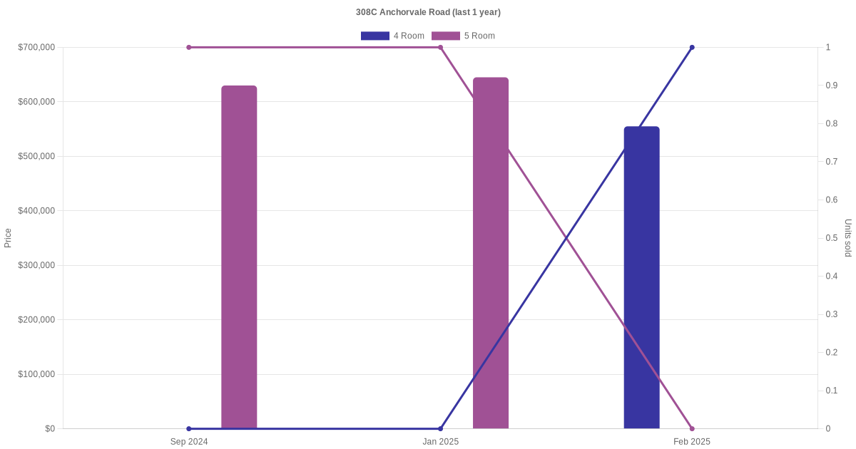 Below is a quick summary of the resale transactions volume and average price trends for the 4 room and 5 room units at 308C Anchorvale Road.