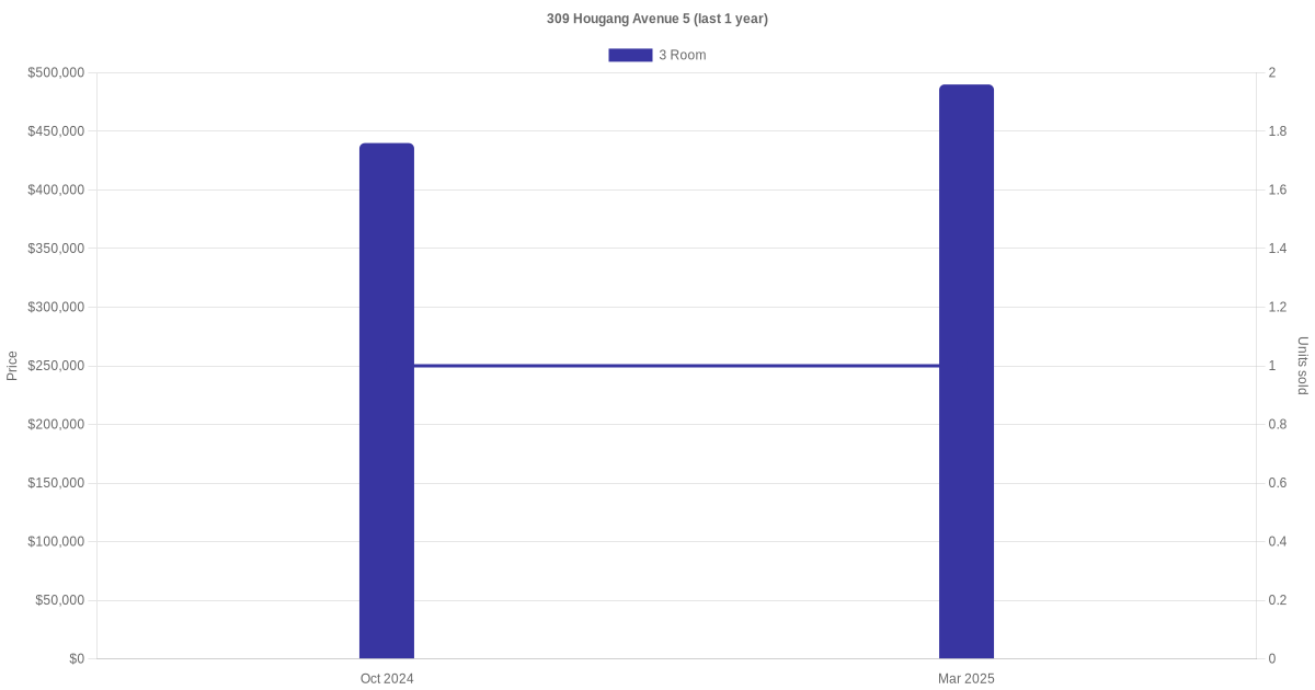 Below is a quick summary of the resale transactions volume and average price trends for the 3 room units at 309 Hougang Avenue 5.