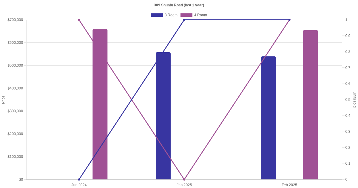 Below is a quick summary of the resale transactions volume and average price trends for the 3 room and 4 room units at 309 Shunfu Road.