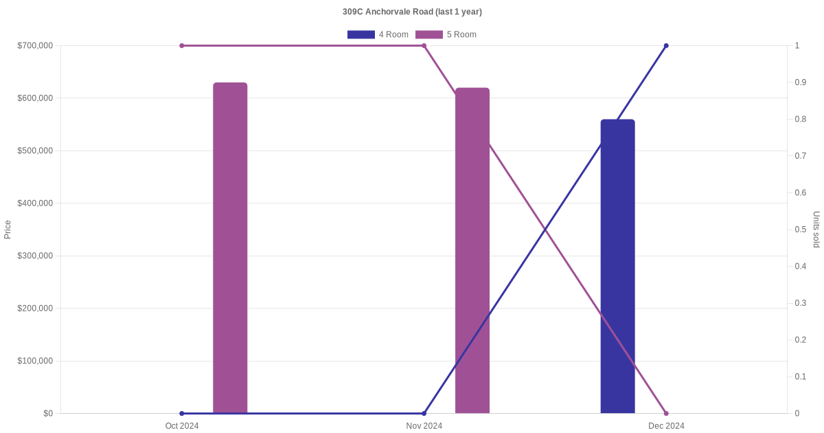 Below is a quick summary of the resale transactions volume and average price trends for the 4 room and 5 room units at 309C Anchorvale Road.