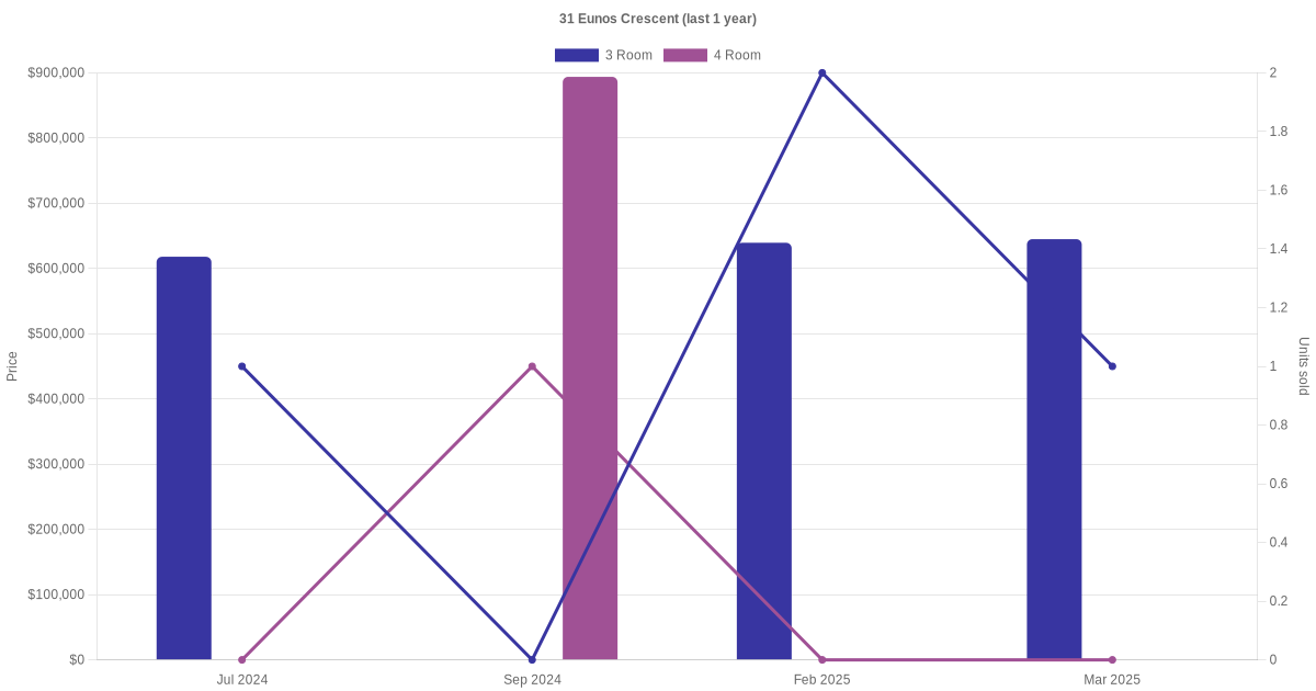Below is a quick summary of the resale transactions volume and average price trends for the 3 room and 4 room units at 31 Eunos Crescent.