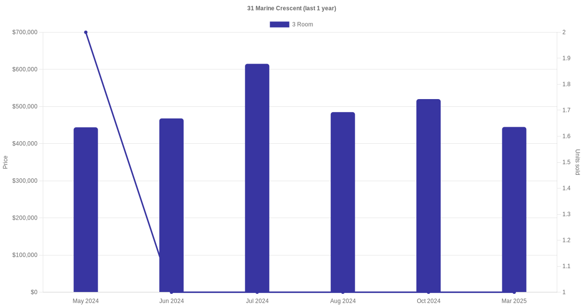 Below is a quick summary of the resale transactions volume and average price trends for the 3 room units at 31 Marine Crescent.