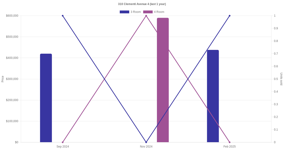 Below is a quick summary of the resale transactions volume and average price trends for the 3 room and 4 room units at 310 Clementi Avenue 4.