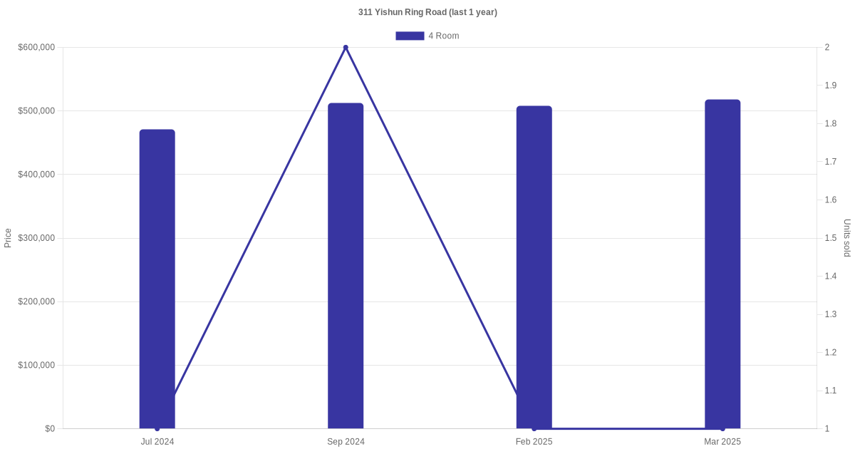 Below is a quick summary of the resale transactions volume and average price trends for the 4 room units at 311 Yishun Ring Road.