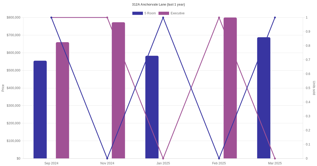 Here's a summary of the rental transactions and price trends for the 5 room and executive units at 312A Anchorvale Lane.