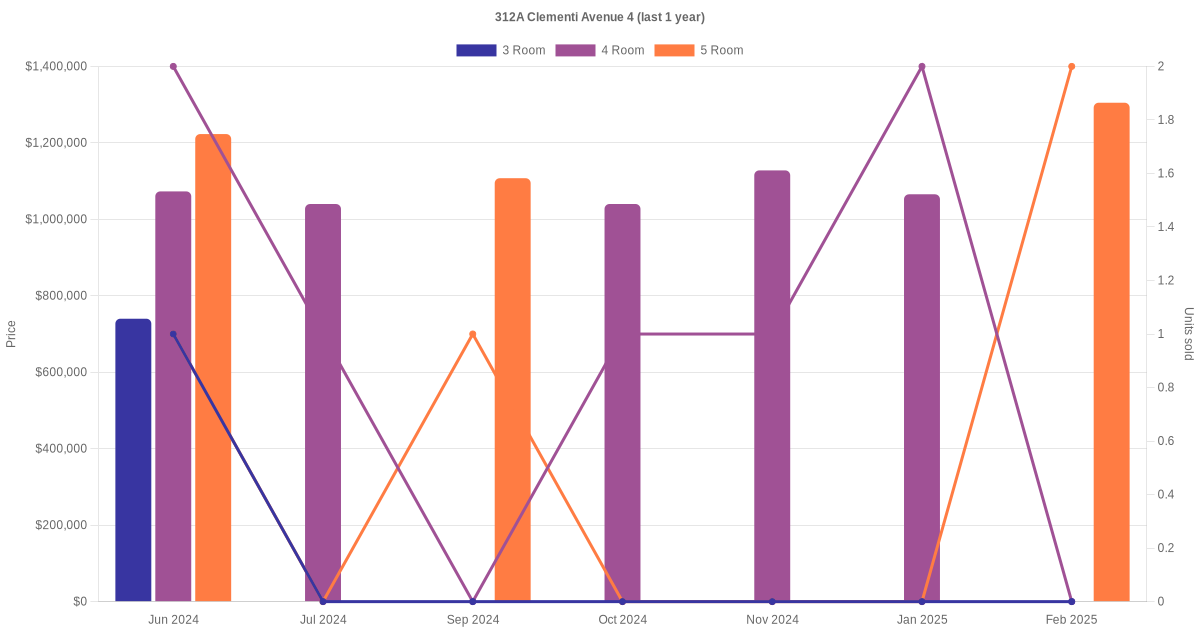Here's a summary of the rental transactions and price trends for the 3 room, 4 room and 5 room units at 312A Clementi Avenue 4.