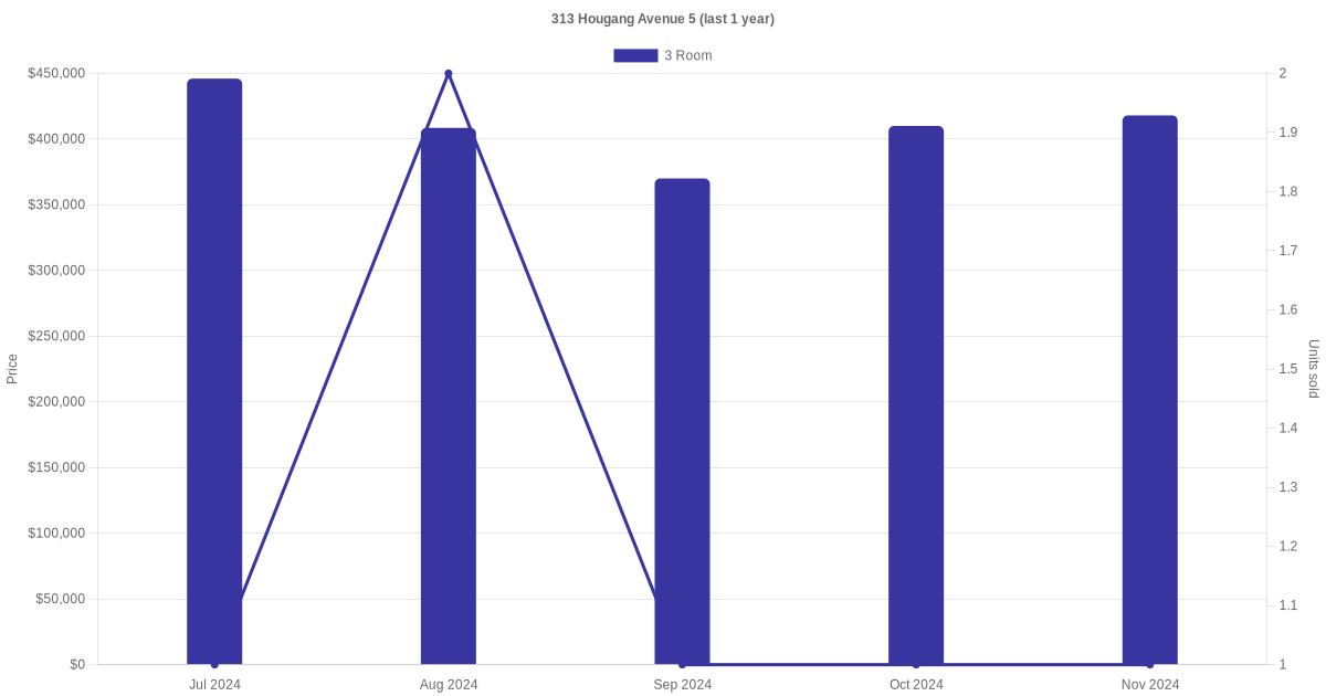 Below is a quick summary of the resale transactions volume and average price trends for the 3 room units at 313 Hougang Avenue 5.