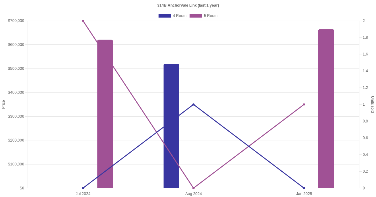 Below is a quick summary of the resale transactions volume and average price trends for the 4 room and 5 room units at 314B Anchorvale Link.