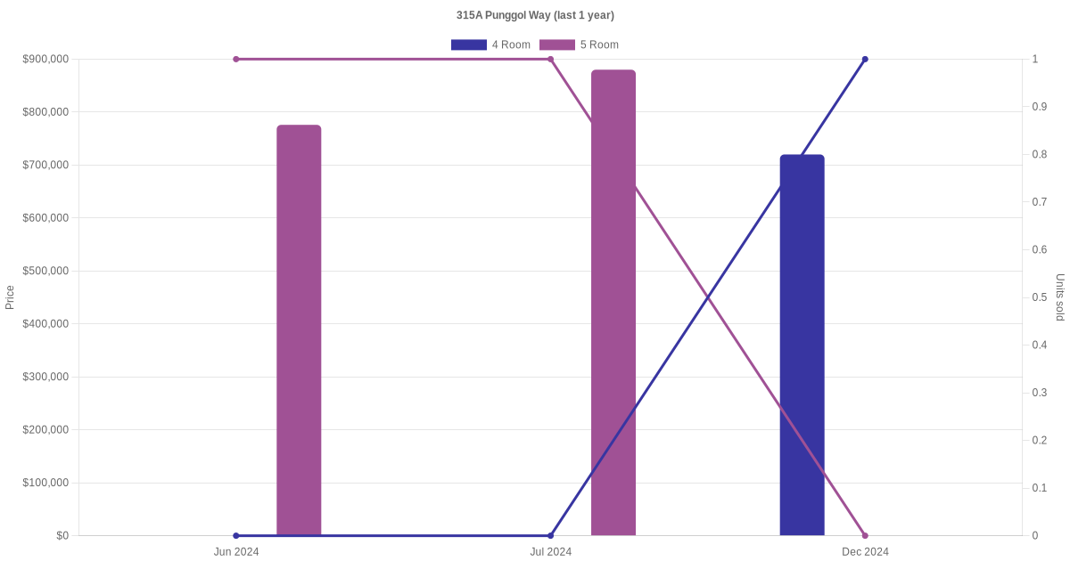 Below is a quick summary of the resale transactions volume and average price trends for the 3 room, 4 room and 5 room units at 315A Punggol Way.