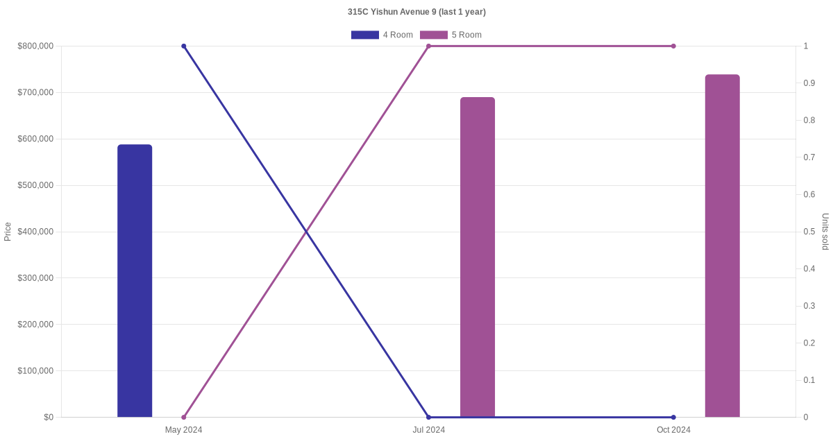 Below is a quick summary of the resale transactions volume and average price trends for the 4 room and 5 room units at 315C Yishun Avenue 9.