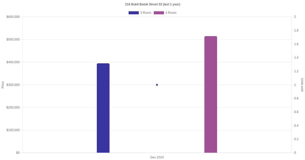 Below is a quick summary of the resale transactions volume and average price trends for the 3 room and 4 room units at 316 Bukit Batok Street 32.