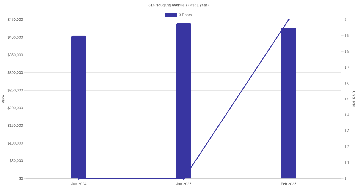 Below is a quick summary of the resale transactions volume and average price trends for the 3 room units at 316 Hougang Avenue 7.