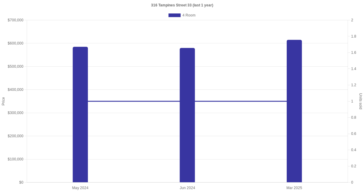 There were a total of 5 resale transactions in the last 3 years for units in block 316 Tampines Street 33, with the latest one recorded in Mar 2025.