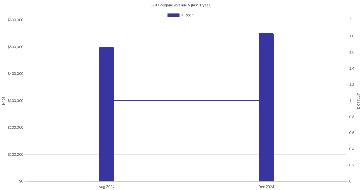 Below is a quick summary of the resale transactions volume and average price trends for the 3 room and 4 room units at 319 Hougang Avenue 5.