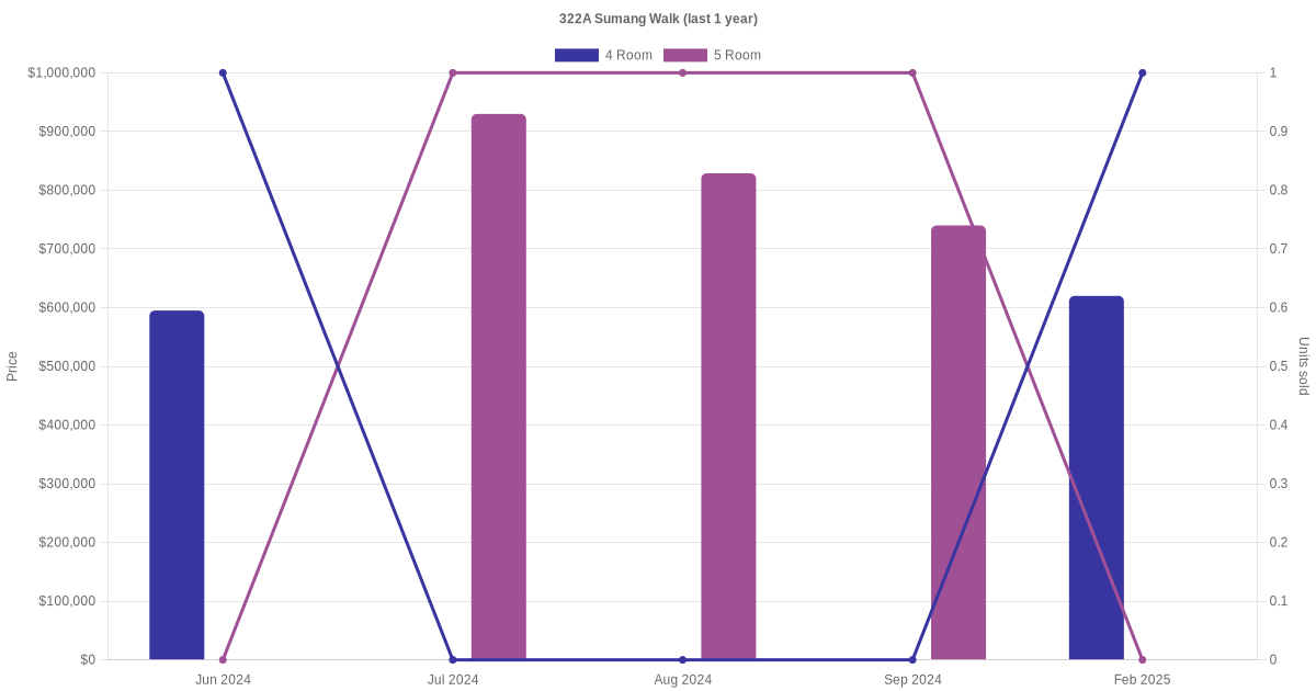 Below is a quick summary of the resale transactions volume and average price trends for the 4 room and 5 room units at 322A Sumang Walk.