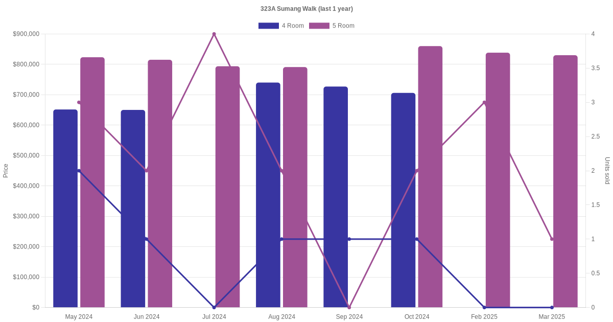 Below is a quick summary of the resale transactions volume and average price trends for the 4 room and 5 room units at 323A Sumang Walk.