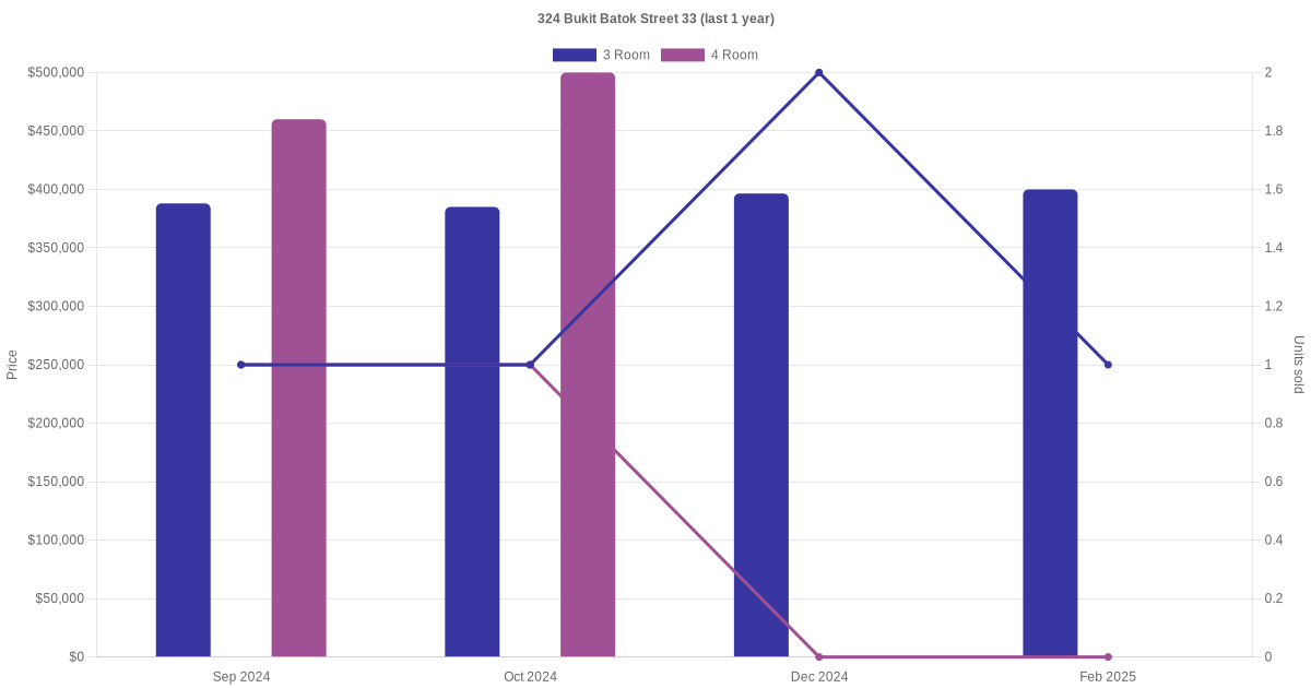 Below is a quick summary of the resale transactions volume and average price trends for the 3 room and 4 room units at 324 Bukit Batok Street 33.