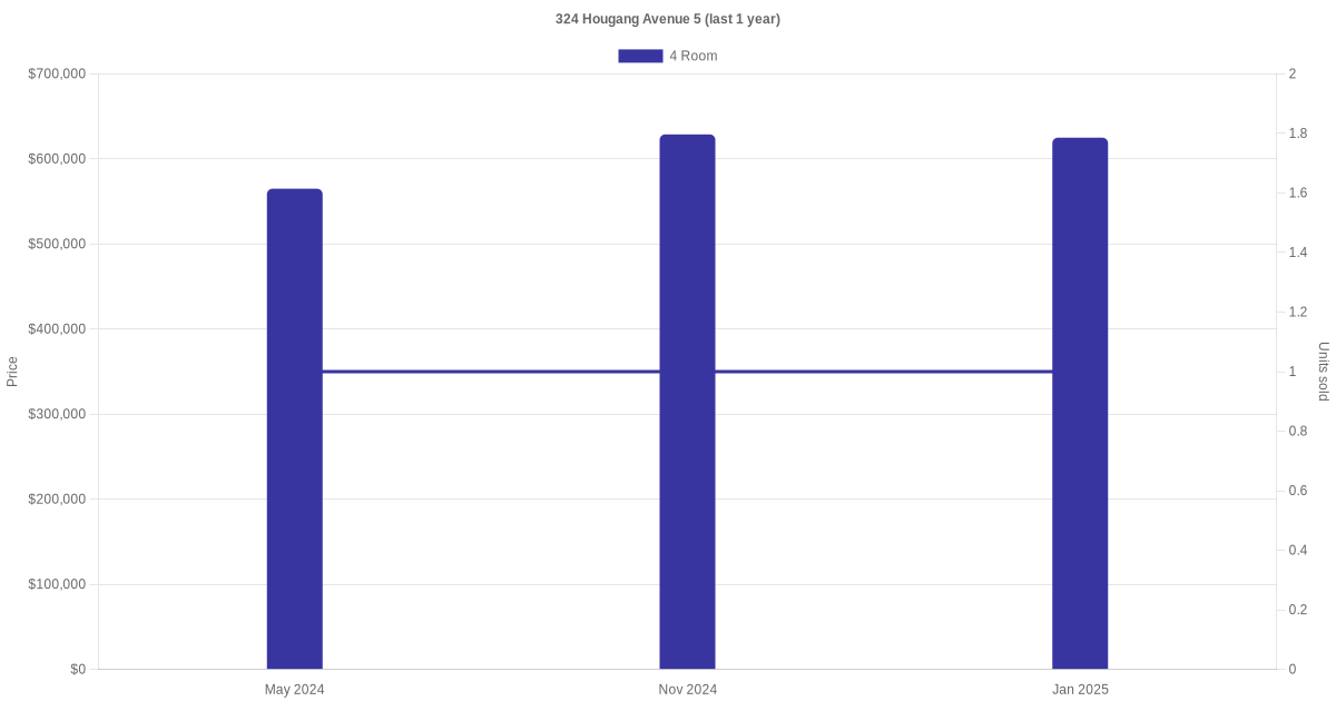 | Jan 2025 | $625,000 | $6,010 | 4 Room | Blk 324 Hougang Avenue 5 4 Room / 104 sqm | 07 to 09 | 104 sqm | Model A | 1983 |