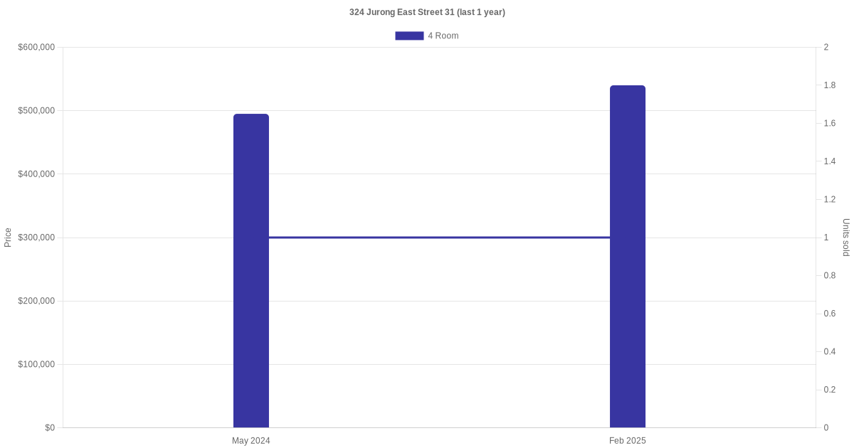 | Mar 2025 | $540,000 | $5,192 | 4 Room | Blk 324 Jurong East Street 31 4 Room / 104 sqm | 07 to 09 | 104 sqm | Model A | 1984 |