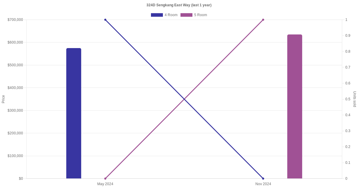 Below is a quick summary of the resale transactions volume and average price trends for the 4 room and 5 room units at 324D Sengkang East Way.