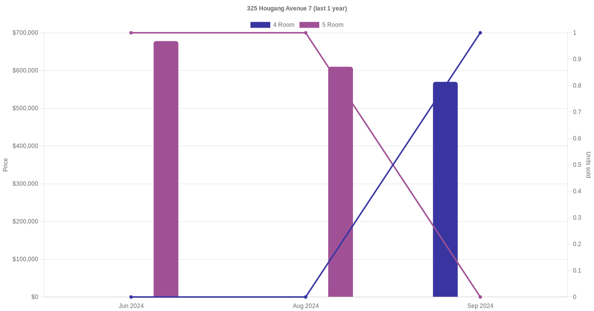 Below is a quick summary of the resale transactions volume and average price trends for the 4 room and 5 room units at 325 Hougang Avenue 7.