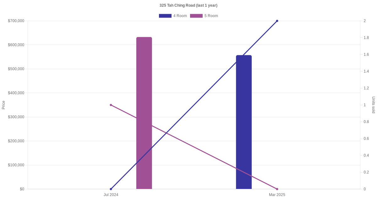 Below is a quick summary of the resale transactions volume and average price trends for the 4 room and 5 room units at 325 Tah Ching Road.