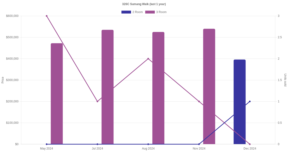 Below is a quick summary of the resale transactions volume and average price trends for the 2 room and 3 room units at 326C Sumang Walk.