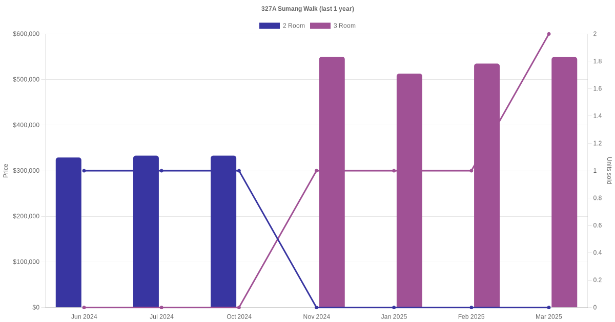 Here's a summary of the rental transactions and price trends for the 2 room and 3 room units at 327A Sumang Walk.