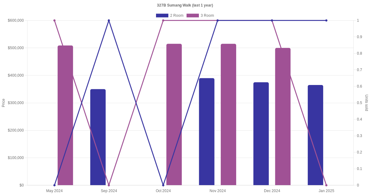 Below is a quick summary of the resale transactions volume and average price trends for the 2 room and 3 room units at 327B Sumang Walk.