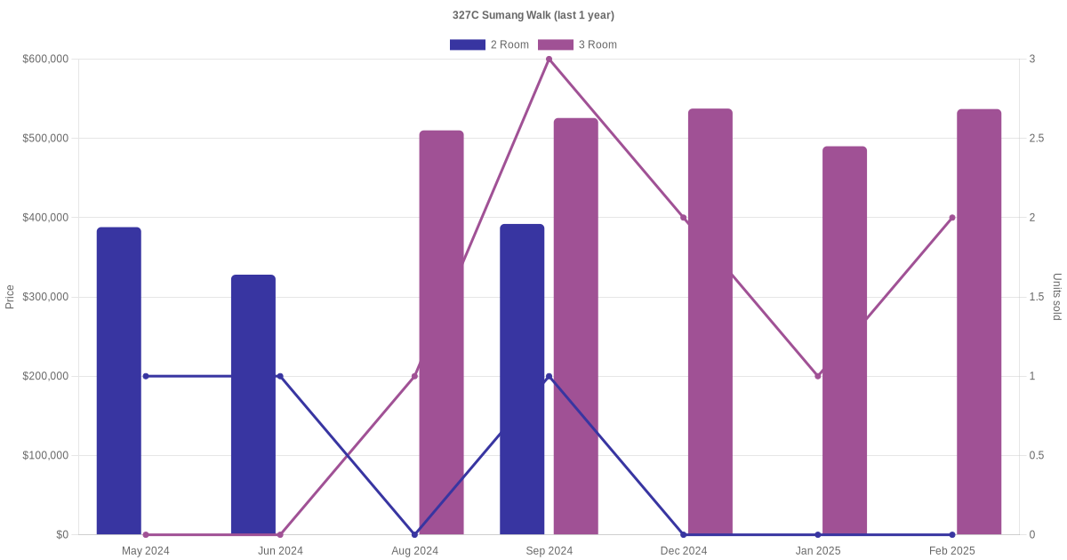 Below is a quick summary of the resale transactions volume and average price trends for the 2 room and 3 room units at 327C Sumang Walk.