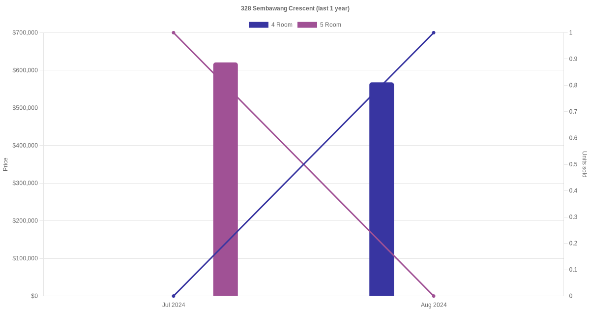 Below is a quick summary of the resale transactions volume and average price trends for the 4 room and 5 room units at 328 Sembawang Crescent.
