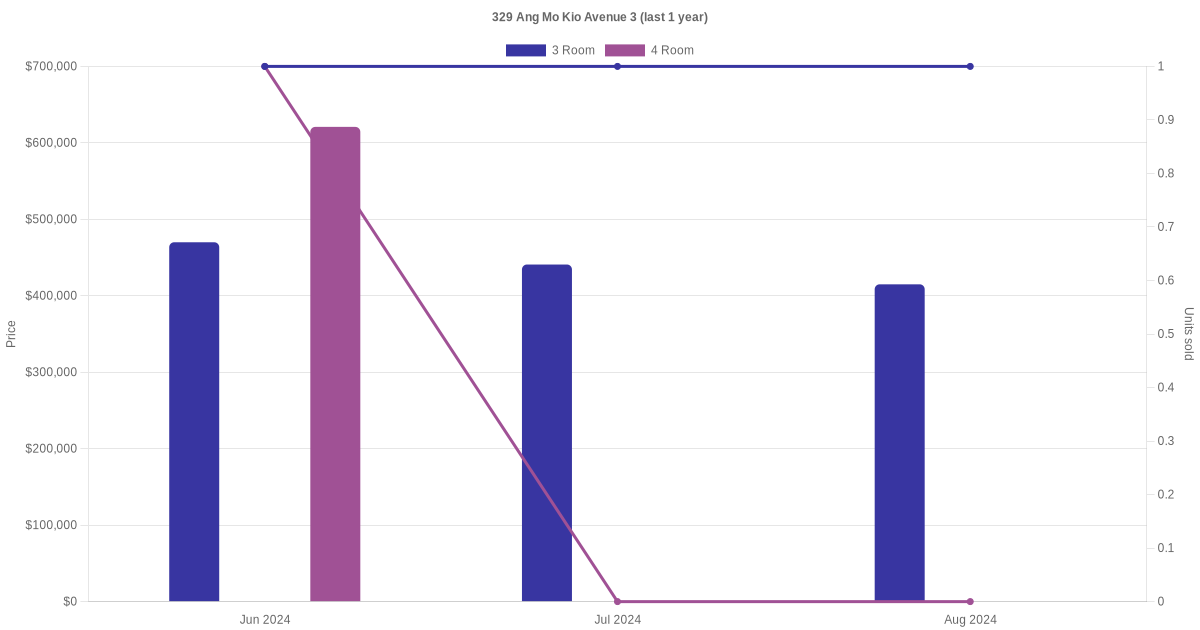 Below is a quick summary of the resale transactions volume and average price trends for the 3 room and 4 room units at 329 Ang Mo Kio Avenue 3.