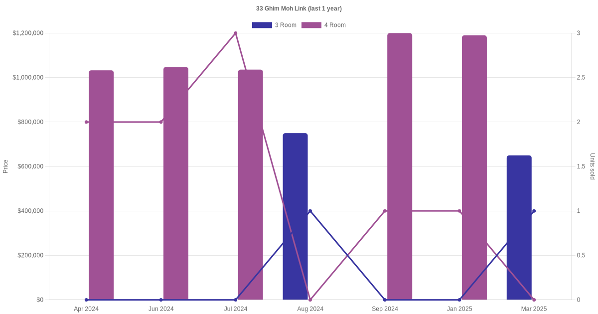 Below is a quick summary of the resale transactions volume and average price trends for the 3 room and 4 room units at 33 Ghim Moh Link.