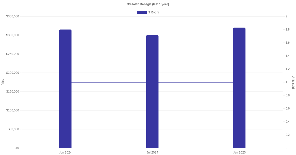 Below is a quick summary of the resale transactions volume and average price trends for the 3 room units at 33 Jalan Bahagia.