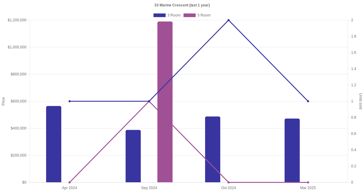 Below is a quick summary of the resale transactions volume and average price trends for the 3 room and 5 room units at 33 Marine Crescent.